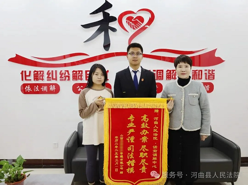 “感謝調解員為我們排憂解難,提供高效便捷的司法服務,本來以為訴訟時間會很長,沒想到這么快就處理好了,今后我們一定努力提高服務水平。”近日,某物業公司將一面寫有“高效辦案盡職盡責 專業嚴謹司法楷模”的錦旗送至河曲法院訴前調解中心,對法院溫馨的訴訟服務和特邀調解員優質高效的調解表示感謝!