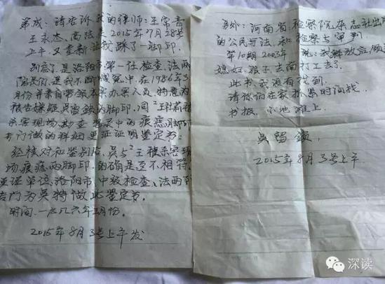 兩封信中敘述到,“河南省高級人民法院于2015年7月28號上午11時親自來到河南省第四監獄提審我,又重新讓我踩了一次腳印。隨后,2015年10月23日,河南省高級人民法院和洛陽市公安局技術鑒定科又一次將我提出監獄,在監獄大門口路南邊的野地半坡上,又重新讓我踩了石膏模擬腳印。”