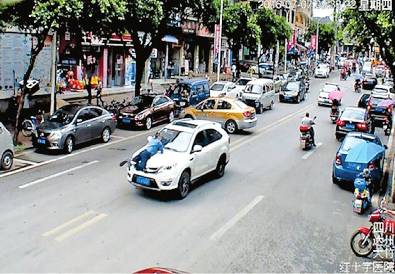 一輛白色的比亞迪轎車,載著一車乘客在市區橫沖直撞,并以時速50公里左右的速度,將一名執法人員撞上引擎蓋,推行了300多米。緊接著,該轎車來了一個急轉彎,把執法人員甩下地面后繼續逃跑……7月7日,電影中的“速度與激情”,在達州市大竹縣城真實上演。
