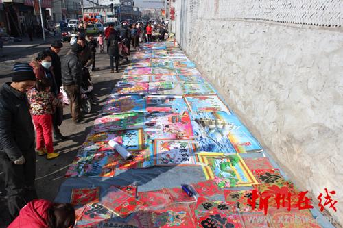 2月1日,在原平市新原鄉解放街村的農貿市場上,村民們正在選購年畫。過年了,不少農村都在集市上選購年畫、春聯、窗花、燈籠、掛件,準備過個祥和喜慶的猴年春節。(曹申義 攝)