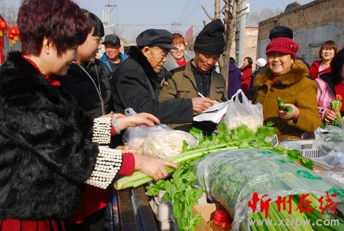 春節期間農村市場依然旺,城里商家還要到村里賣菜。正月初三攝于代縣西馬村。(楊峻峰 攝)