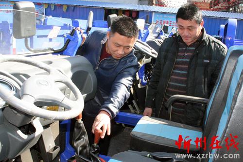 2月20日,原平市子干村的農民正在農機銷售處挑選時風農用車,春節過后,該市農機市場紅紅火火,農民們早備耕,為今年的春耕生產打下良好基礎。(趙春曉 攝)