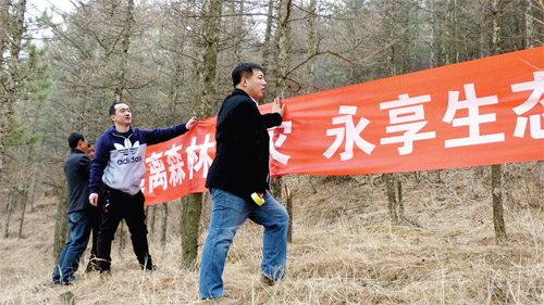 清明節來臨之際,靜樂公路管理段駐赤泥窊鄉范家洼村扶貧工作隊深入開展護林防火宣傳。圖為工作隊員深入林區懸掛護林防火標語。(李永珍 攝)