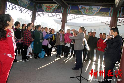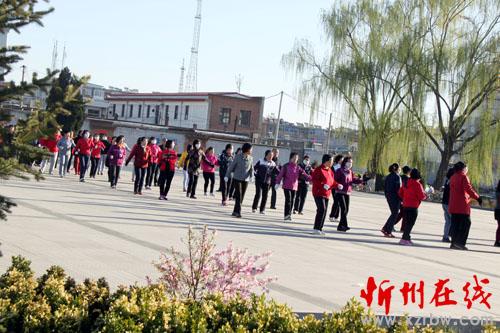 4月8日。原平市市民們正在環境優美的范亭廣場上,彈拉琴唱,強身健體歌聲飄揚樂悠悠,享受著春天氣息和如今好生活。(趙春曉 攝)
