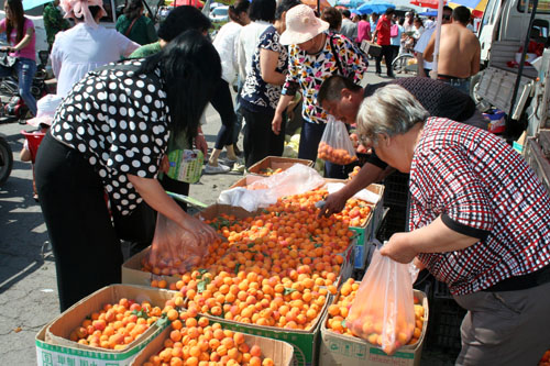6月12日,被譽為大杏之村原平市解村鄉余家溝村的農民正在集貿市場賣大杏,市民們正在挑選購買很受青睞。該市大力發展一村一品水果種植栽培業,多措并舉促進了農民增收。(趙春曉 攝)