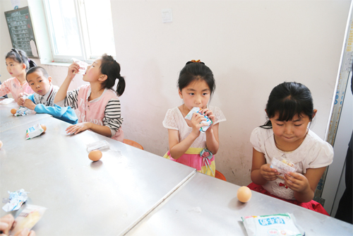 6 月23 日,靜樂縣中莊鄉中莊村小學學生正在吃領到的“營養餐”。截至目前,該縣共有4所初中、32 所小學、40 個教學點的2391 名中小學生每天均可享受到農村義務教育“營養餐”所帶來的溫暖。(閆曉梅 攝)