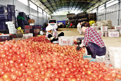 6 月22 日,定襄縣受祿鄉富達農業合作社的農戶們將采摘的西紅柿裝筐準備外銷。近年來,定襄縣立足自然資源優勢,積極引導農民調整產業結構,大力發展設施農業,促進了農業增效、農民增收。(張玉虎 攝)