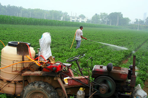 7月11日,原平市南灘村種植的三百畝北京紅辣椒長勢喜人。農民們正在田間用電動噴灑器噴灑葉面肥,該肥能增產增效防病害。該村調整種植產業結構,發展高效農業種植,促進增產增收。讓農民們鼓起錢袋子。(趙春曉 攝)