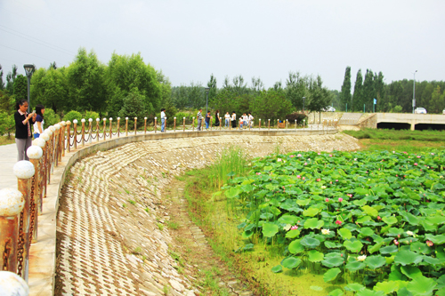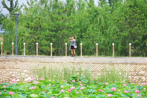 7月21日,原平市滹沱河生態公園游人正在賞荷花,品味其美麗。七月的荷花,飄香過池,清新自然的氣息,讓人心曠神怡!而在淅淅瀝瀝的細雨后賞荷花,又是一種情境:少了日曬的悶熱,或漫步荷池小道,或跨上拱橋,或合上雨傘,盡情享受雨后的清涼,欣賞池中荷花的千姿百態。