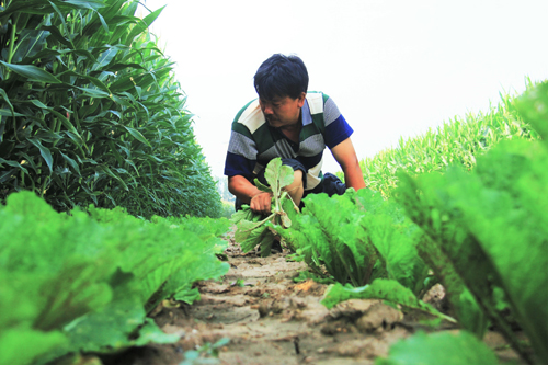 近日,原平市平地泉村民正在進行回茬菜田間管理。原平市平地泉村民2000畝回茬菜,根據市場需求,實施訂單和零售交叉種植,滿足不同客戶的需求,使冬儲菜成為土地增效農民增收的一大品牌。(吉建平 攝)