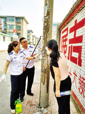 記者在利民西街看到,城管隊員手拿噴水器、小鏟子,對路邊電桿、墻壁、公交站牌等處的“小廣告”逐一認真清理。不少“小廣告”由于粘貼得比較牢靠,隊員們用手撕扯后再沖洗,但被粘貼的位置依然留下了斑斑痕跡,再一次經過重復操作,“小廣告”才被徹底清除。圖為工作人員正在清理“小廣告”(張志遠 攝)