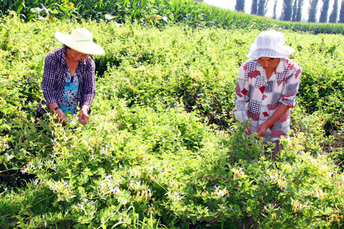 7月28日,原平市桃園村農民正在采摘滿地盛開的金銀花,他們高興地說“種的金銀花,如今有錢花。該市積極引導農民調整農業生產結構,大力發展特色高效種植業,促進農業增產,農民增收, 加快了脫貧致富達小康步伐。(趙春曉 攝)