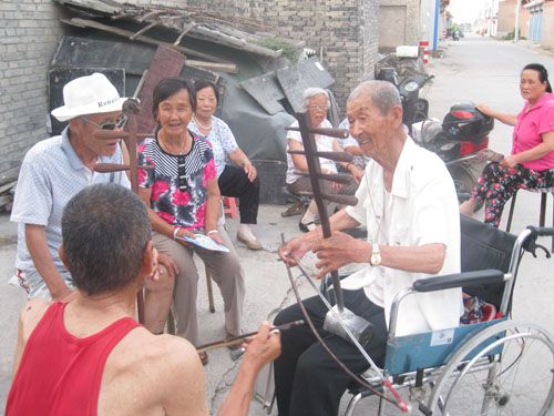 7月31日,河曲縣北元村一處街頭巷口傳出陣陣音樂和“山曲兒”聲。愛好文藝的氣象局退休人員段王鎖和村民經常相聚街頭巷口,吹的吹,拉的拉,唱的唱,每每吸引鄉親們前來共享“農家樂”。既起到了陶情怡性的作用,也給鄉親們帶來具有鄉土風味的精神食糧。(賈金理 攝)