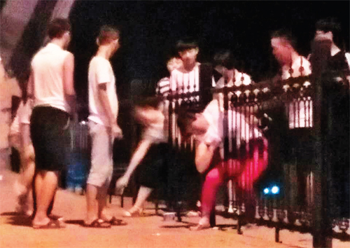 8月9日晚21點左右,在城區云中河景區游園乘涼的市民依然絡繹不絕。一群十五六歲學生模樣的青年將幕山橋上的鐵柵欄分開,一個個鉆過隔離欄魚貫而出,引來橋上欣賞夜景的市民們一片譴責之聲。