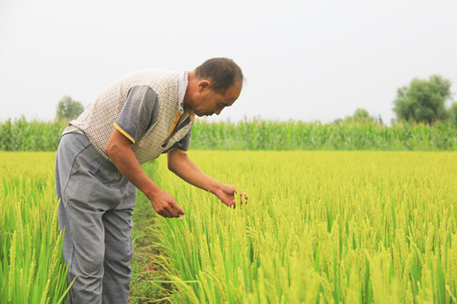 8月13日,原平市大庫狄村民王財旺正在稻田里查看長勢。山西省原平市大庫狄村依傍滹沱河不缺水的優勢,發展水稻特色種植,生產的優質大米成為品牌,商家客戶上門收購,富了村民。預計今年畝產可達到千斤。(吉建平 攝)