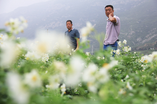 8月13日,原平市紅池村民正在土豆地里查看長勢,兩人看著喜人的土豆開心的笑了。原平市山區農民根據土地土壤結構松散的特點,以種植土豆為主要農作物,不分地塊大小,也不論坡地還是平地,長出的土豆個頭大好吃,既可以當主食食用,也可以制作為蔬菜,一食多用,是餐桌上的香餑餑,銷售價格節節攀升,是山區百姓脫貧致富的金圪蛋。(吉建平 攝)