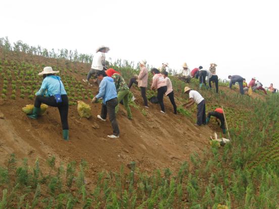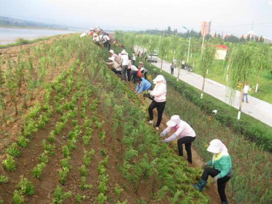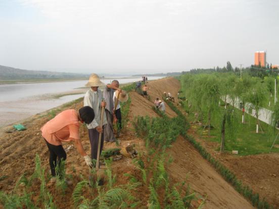 8月24日,河曲縣城北防護堤上植綠場面熱火朝天:數十名工人在堤上成排栽植爬地柏,坡面栽成菱形邊;菱形內外栽植花草“三七景天”;園林綠化車輛跟進澆水。