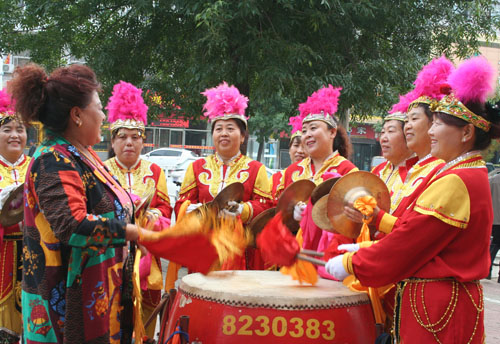 9月26日,原平市姐妹威風鑼鼓隊的人員正在敲鑼打鼓慶豐收,進入金秋以來。該市群眾們采取形式多樣豐富多彩的活動來慶豐收