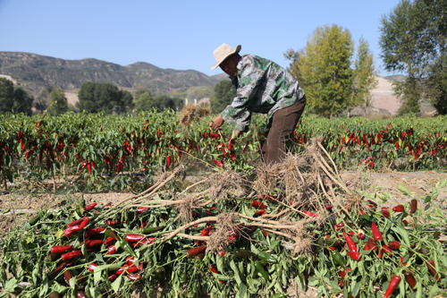 10月8日,靜樂縣永倉種植專業(yè)合作社萬畝辣椒種植示范園中10300畝辣椒喜獲豐收。近年來,該縣調整產業(yè)結構,大力發(fā)展無公害辣椒種植,引進種植新品種韓國紅辣椒。該合作社今年連片訂單栽植的10300 畝辣椒目前長勢良好,預計平均畝產6000 斤,最高可達一萬斤。今年又是一個豐產年,大伙的生活就像紅辣椒一樣過得紅紅火火。圖為合作社工人在收獲辣椒。(閆曉梅 攝)