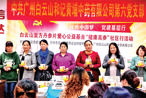 本報訊 10月21日,白云山和黃中藥公司復(fù)方丹參片愛心公益基金志愿者服務(wù)隊與忻州市吉達(dá)惠康連鎖藥店聯(lián)合主辦了“紅色中國夢、黨建基層行”愛心公益活動,向社區(qū)居民贈送了健康體檢卡及健康藥物禮包,并開展了一系列的黨建文化交流活動。