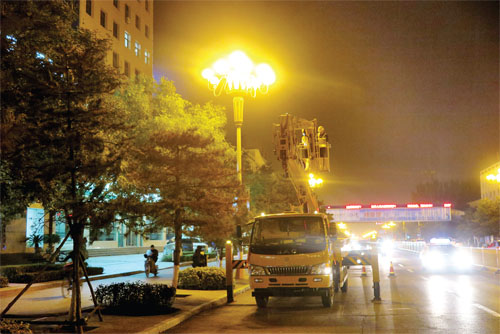 路燈檢修工人穿好工作服,戴上安全帽,登上搶修車的工作臺,對路燈、接線箱、燈桿等照明設施進行了全面細致的檢查、維護、更換。10月26日9時許,記者在我市城區長征路上看到,市政公司組織工人冒著凜冽的寒風,正在對道路兩旁損壞的路燈進行更換,確保夜幕下城區的每一盞路燈都能夠正常照明。圖為工人師傅正在長征路上對損壞的路燈進行更換。(張志遠 王菲 攝)