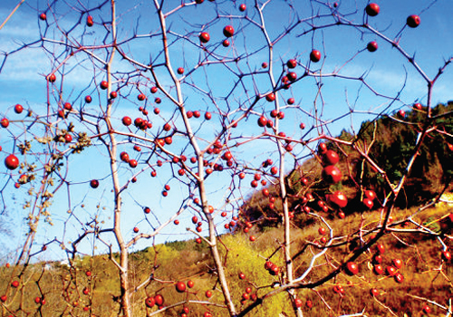 春天山坡上到處都是長出來的小酸棗樹。鄉(xiāng)民秋天能隨處摘到紅艷艷的酸棗果。小時候,我們眼巴巴盼著能吃到的就是這種酸中帶甜的小果子,而經(jīng)常給幼時的我采摘這種小果子的就是我的姥爺。