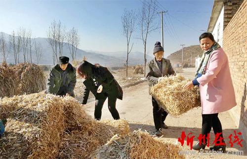 “各精準扶貧戶,現在到村委會院內給羊領取草料,快些??!”12月10日上午,岢嵐縣嵐漪鎮石家會村的大喇叭上不斷傳來廣播,村民們奔走相告,在村的精準扶貧對象紛紛來到村委會院內。頓時,村委會院內像過年一樣熱鬧,拉草料的大車已經停了一溜,每輛車上都是50斤一捆的草料,臺階上擺著整齊的桃心圖案的漆布、嶄新的鍋蓋、床單,第一書記楊英正在跑前跑后招呼著老鄉們前來領取物品、簽字。