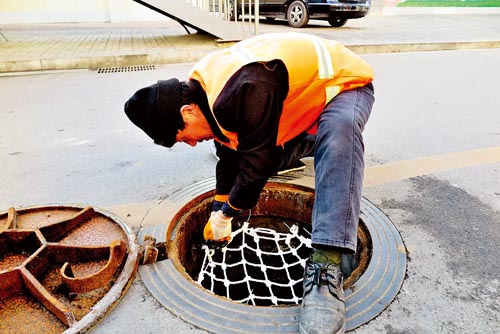 近日,忻州市市政公司組織員工,為城區道路上的下水井加裝尼龍繩防護網。防護網可承載一個人的重量,可以有效防止行人不慎墜落下水井的事故發生。圖為市政公司職工正在七一路小學附近的道路上安裝防護網。(魯明強 攝)