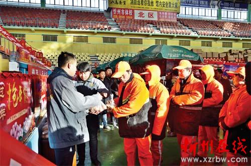 1月19日上午,山西熊奪寶網(wǎng)絡(luò)科技有限公司面向忻州市環(huán)衛(wèi)系統(tǒng)開展“獻(xiàn)愛心迎佳節(jié)”活動,來自忻州市市容環(huán)境衛(wèi)生管理處的50名環(huán)衛(wèi)工人代表,每人領(lǐng)到了一份新鮮雞蛋?,F(xiàn)場的一位工作人員告訴記者:“環(huán)衛(wèi)工人們?yōu)榱顺鞘械母蓛粽麧嵏冻隽诵燎诘暮顾?,希望這些雞蛋能為他們補(bǔ)補(bǔ)身體。除現(xiàn)場領(lǐng)取雞蛋的50名環(huán)衛(wèi)工人之外,我市另外的1000多名環(huán)衛(wèi)工人也將陸續(xù)領(lǐng)到愛心雞蛋?!鳖I(lǐng)到雞蛋的環(huán)衛(wèi)工李大姐高興地說:“今年過年雞蛋也不用買了,實(shí)在是太好了!”(王菲 郭劍鳴 攝)