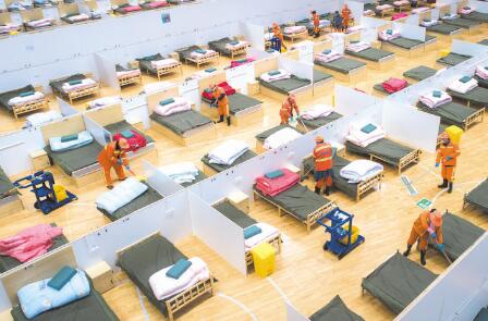 2月12日,在武漢體育中心方艙醫院,工人在進行整理和清潔工作。