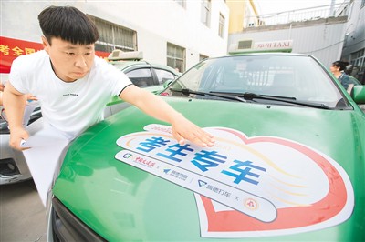 網絡出行平臺高德打車聯合有關方面推出“愛心送考 ”免費服務。圖為參與提供服務的工作人員給車貼相關標識。