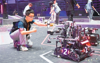 5月21日至5月25日,全國大學生機器人大賽——RoboMaster2025機甲大師超級對抗賽·區域賽(中部賽區)在湖南省長沙市舉行。圖為合肥工業大學蒼穹戰隊隊員在比賽間隙調試機器人。新華社記者 陳振海攝