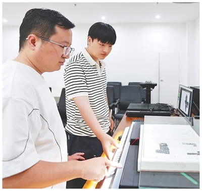 實驗室內,張展(左)正在和學生掃描錄入甲骨文拓本。霍亞平攝