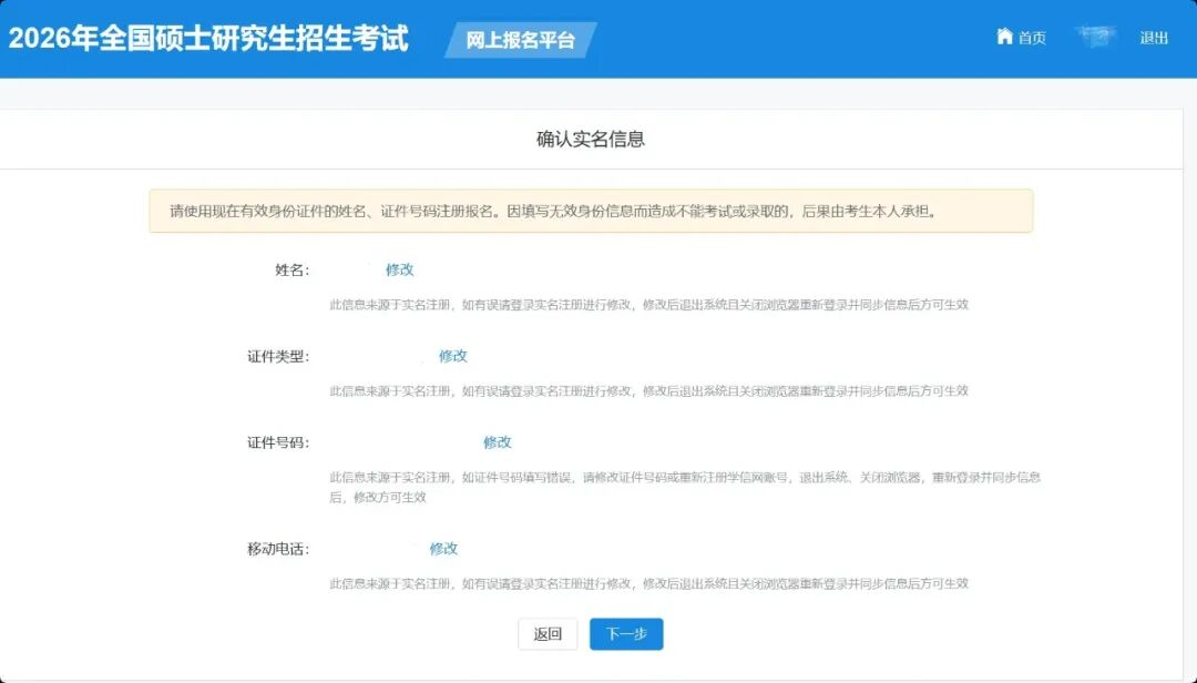 >>>已有賬號的考生無需重復注冊。 填寫考生信息功能已于9月30日開通,一直持續到10月27日22:00報名結束。在此期間,考生可登錄網報系統先進行考生信息的填寫和修改,在報名時僅填寫報考信息即可。 在這個階段,考生可以參照《2026年統考考生需準備的網報信息》,先把個人信息準備在一個word或excel表格里,然后按照系統提示進行填寫。 登錄之后,需先確認實名信息(此信息來源于學信網實名注冊信息,請考生仔細核對)。