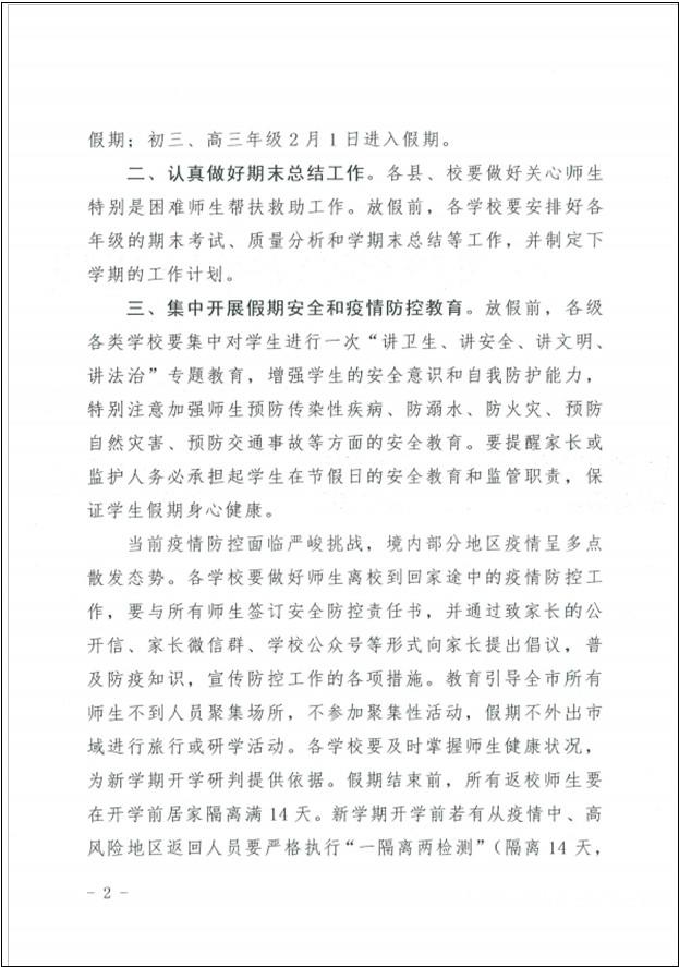 根據(jù)省、市疫情防控工作領(lǐng)導(dǎo)小組及省教育廳視頻會(huì)議精神和我市新冠疫情防控最新形勢,為保障全市師生生命安全和身體健康;經(jīng)市委、市政府同意,現(xiàn)將2021年寒假及假期前后工作安排如下,請遵照執(zhí)行。