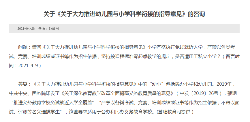 新華網北京4月28日電 近日,教育部在回應網友咨詢《關于大力推進幼兒園與小學科學銜接的指導意見》相關問題時表示,該指導意見中的“幼小”包括民辦小學和幼兒園。2019年,中共中央、國務院印發了《關于深化教育教學改革全面提高義務教育質量的意見》(中發〔2019〕26號),強調“推進義務教育學校免試就近入學全覆蓋”“嚴禁以各類考試、競賽、培訓成績或證書等作為招生依據,不得以面試、評測等名義選拔學生”,這些要求適用于公辦和民辦義務教育學校。