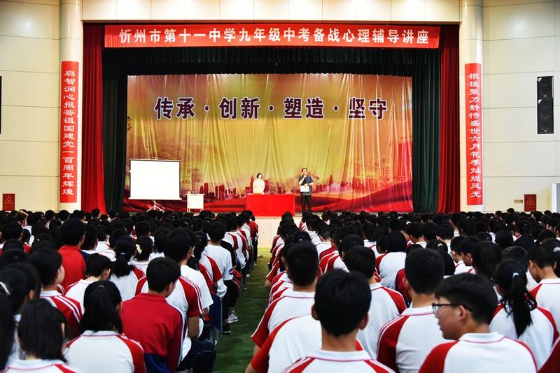 本網訊 6月3日晚,忻州十一中特邀資深心理專家張廣梅老師在文體苑為九年級學生做了中考備戰心理輔導講座。校長張云長主持講座并講話。
