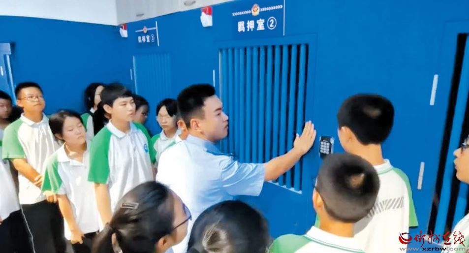 法院干警向?qū)W生們展示警用器械,詳細(xì)介紹了八件套、電子腳銬、束縛帶、盾牌等常用器械的使用方法和適用場合。大家聽完后,顯示出濃厚興趣,躍躍欲試,在法警叔叔的指導(dǎo)下,體驗(yàn)了各類警用器械。之后,學(xué)生們還參觀了羈押室。