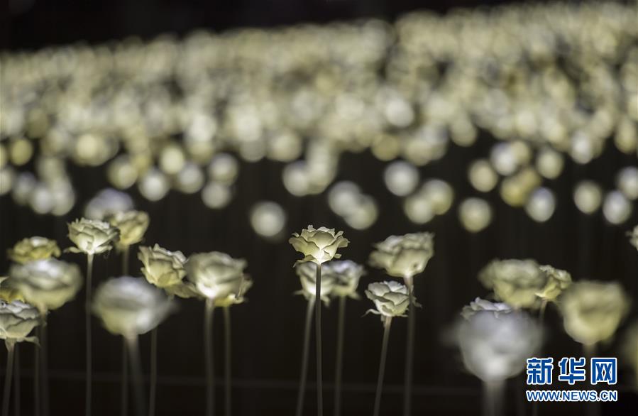 這是在中環海濱拍攝的白玫瑰花燈(2月13日攝)。 2月13日,來自韓國首爾的LED Rose Garden大型公共展覽亮相香港。25000朵LED白玫瑰花燈在中環海濱展出,在情人節即將到來之際點亮維港,營造出浪漫甜蜜的氛圍。新華社記者 呂小煒 攝
