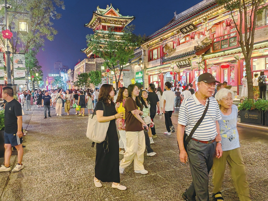 8月2日,入夜后的太原市鐘樓街燈火璀璨、熱鬧非凡,市民們來此散步休閑、購物娛樂,體驗多元消費業態。