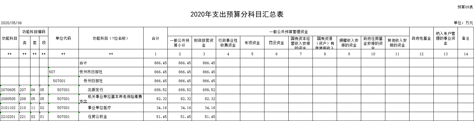 9、一般公共預算支出預算分功能科目匯總表