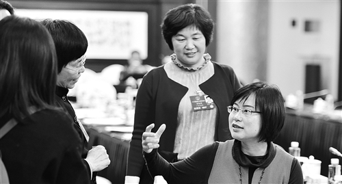 3月11日,人大廣東代表團在駐地舉行分組會議。全國人大代表龍芳(右一)、李淑明(右二)與同團代表在討論“一帶一路”戰略對廣東企業“走出去”產生的影響。本報記者 李景錄攝