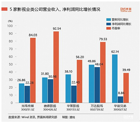 據界面報道,根據財報顯示,華誼兄弟2015年影視娛樂版塊營業收入較上年同期相比增135.80%,達到28.32億元,營業成本較上年同期增長135.80%,達到16.62億,毛利率較上年減少了3.05%,達到41.35%。在報告期內,公司上映的主要是《奔跑吧兄弟》《天將雄師》《梔子花開》、《命中注定》《尋龍訣》《老炮兒》等16部,電影的總票房約43億。