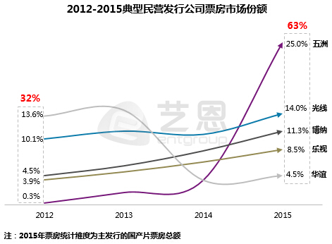 根據藝恩研究報告顯示,華誼兄弟從2012年的13.6%的市場份額一路跌至2015年的4.5%,而由萬達影視牽頭的五洲發行市場份額一路從0.3%飆升至25%,華誼的電影份額被一路碾壓。而萬達影視也即將以注入上市公司的方式登陸A股市場。