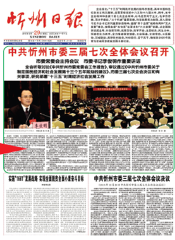 中國共產黨忻州市第三屆委員會第七次全體會議于12月28日在忻州召開。全會聽取討論了《中共忻州市委常委會工作報告》,審議通過了《中共忻州市委關于制定國民經濟和社會發展第十三個五年規劃的建議》,研究部署了“十三五”時期經濟社會發展工作。