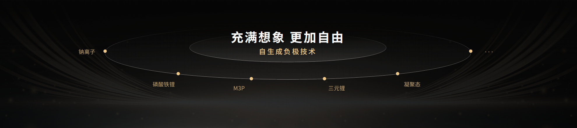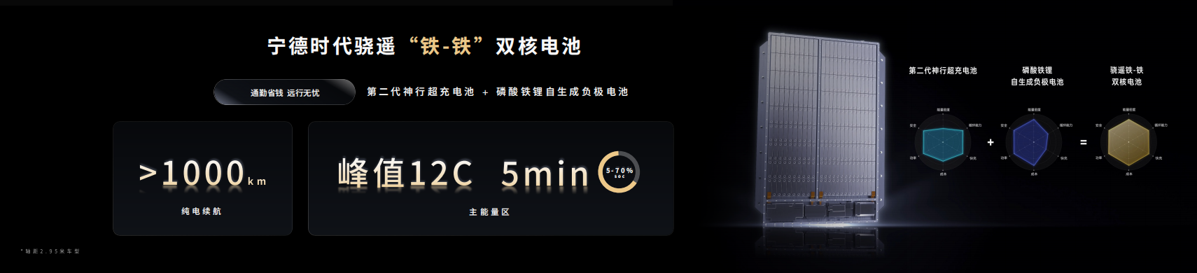 三元鐵/雙三元雙核電池:三元電池+磷酸鐵鋰自生成負極電池,主能量區三元電池充電倍率峰值可達12C,能提供超1兆瓦的強勁動力,當電量低至20%時仍可輸出超600KW的功率;由三元電池+三元自生成負極電池搭配的升級版產品——驍遙“雙三元”雙核電池,在軸距3米的轎車上配電量可突破180度,純電續航里程突破1500公里。