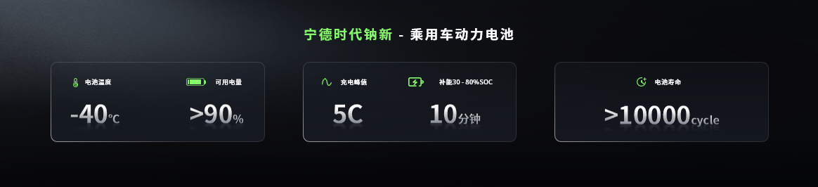鈉新乘用車動力電池的能量密度達175Wh/kg,為當前全球鈉電最高,比肩磷酸鐵鋰電池;支持峰值5C的充電速率和500公里續航,實現超1萬個循環的壽命,同時大幅降低維護成本。在安全性上,鈉新電池從材料本征層面消除電池熱失控中的助燃因素,實現電池安全從"被動防御"到"本質安全"的跨越式突破。