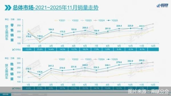 車市正進入平穩發展階段。12月8日,中國汽車流通協會乘用車市場信息聯席分會(以下簡稱“乘聯分會”)發布的數據顯示,2025年前11個月零售2148.3萬輛,整體保持增長。不過,今年11月車市零售量同比、環比均出現下滑。“11月乘用車市場銷量環比出現下降,是比較少見的。”乘聯分會秘書長崔東樹認為,今年上半年,我國乘用車市場銷量實現較快增長,下半年車市增長需回到合理、穩定的狀態。車市進入平穩期有利于市場長期穩定發展,預計今年零售將增長5%。