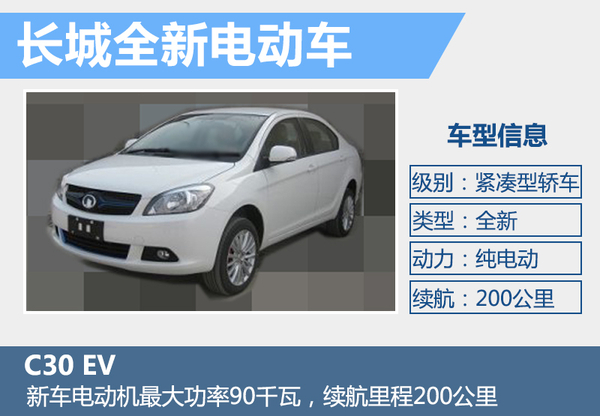 根據長城汽車此前公布消息,旗下首款純電動轎車將于2016年上市。網通社獲得了一組長城全新電動車型C30 EV的諜照及部分信息,新車外觀方面較燃油版車型在細節方面進行調整,加入更多“EV”元素。新車搭載一臺功率為90千瓦的電動機,續航里程有望達到200公里。