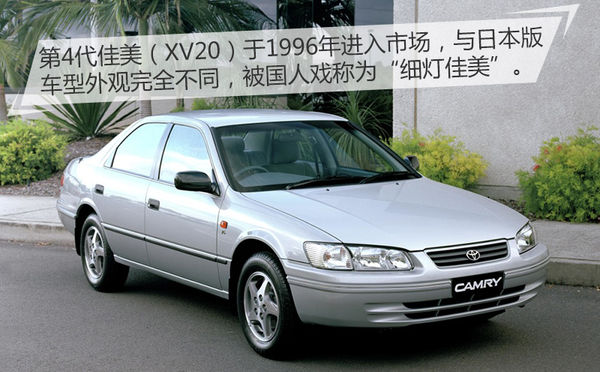 第4代佳美(XV20)于1996年進入市場,進入國內的仍是佳美海外版車型,在設計上與日本本土版采用了完全不同的理念。讓整車看上去更加修長流暢,車頭和車尾都被設計得趨于扁平,由此帶來的是更細長的頭燈和尾燈,所以XV20在國內被人們戲稱為“細燈佳美”。